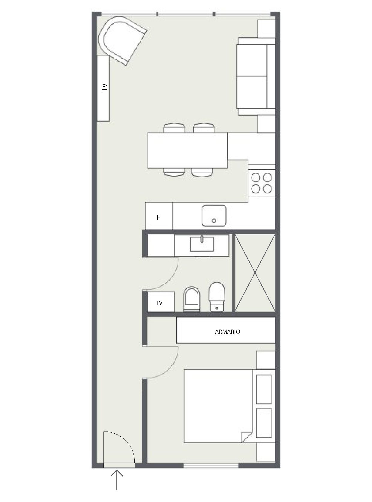 Se distribuye en hall de entrada con lucernarios que inundan de luz natural la vivienda, un dormitorio con cama de matrimonio armario empotrado.