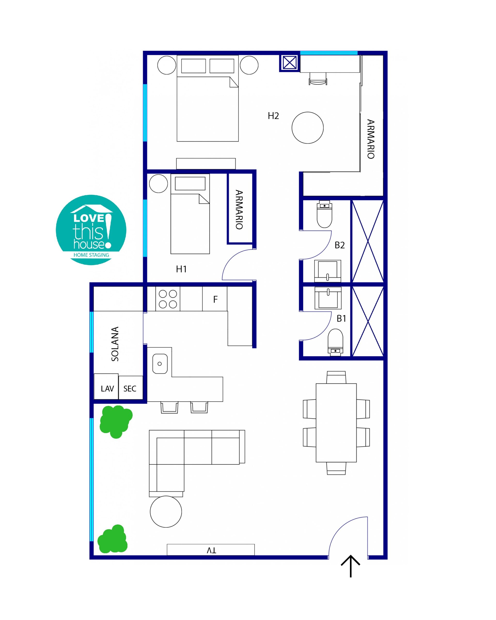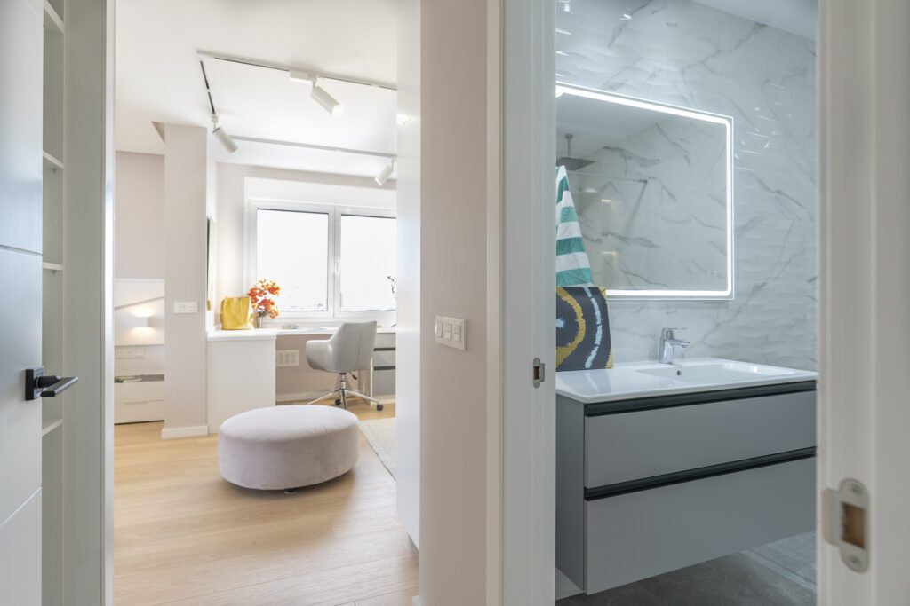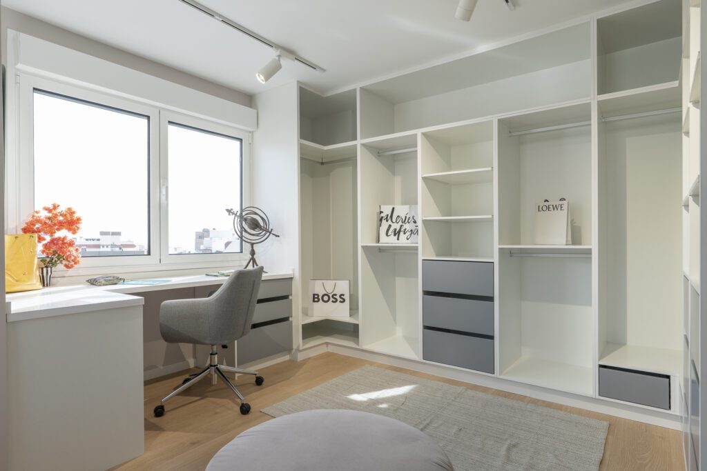 It has two beautiful bathrooms with walk-in showers, one bedroom with a mid-size bed and built-in wardrobe, and a gigantic suite with large windows, a king-size bed, projector screen, open walk-in closet, and office space.